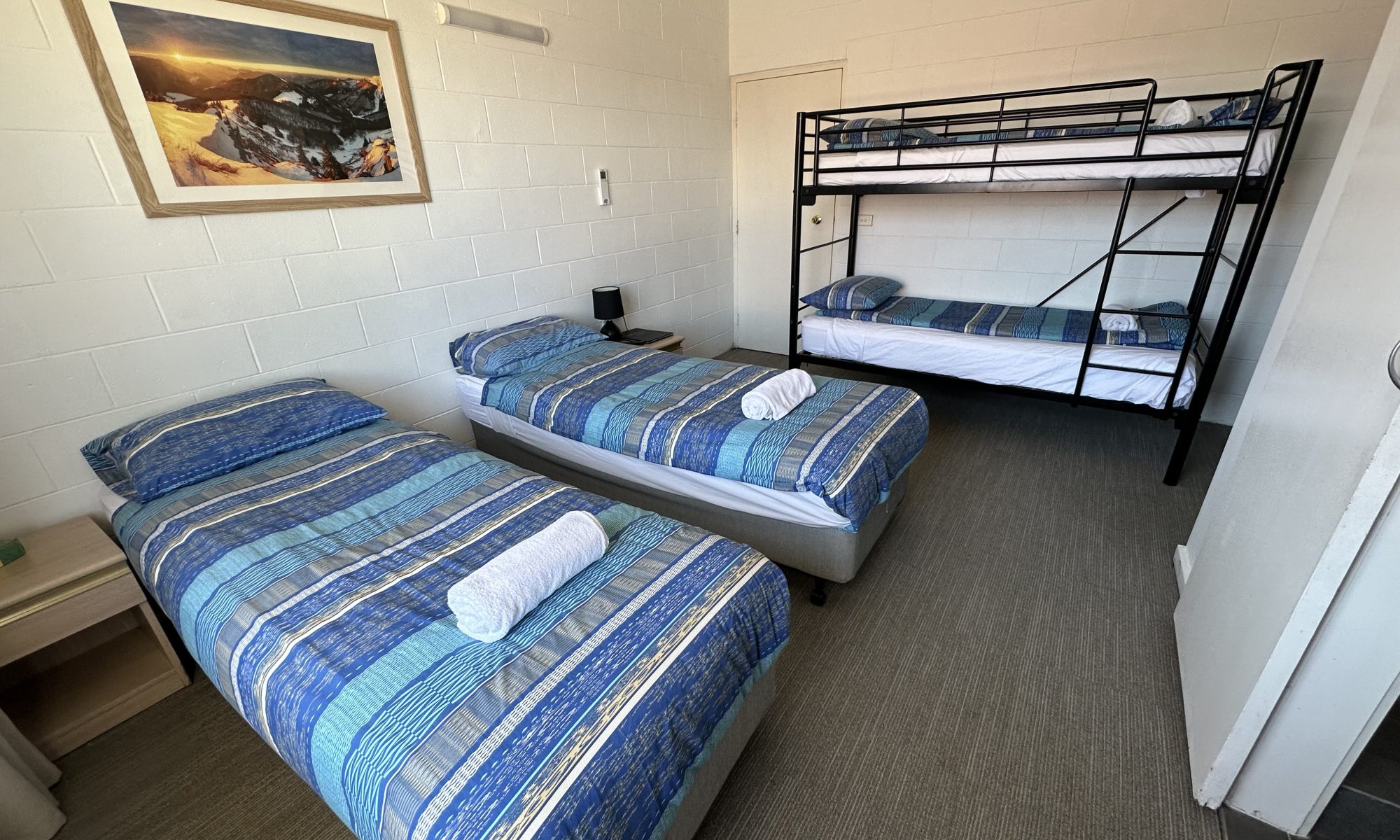 Cosy and basic 2 star budget rooms (18m square) feature a 2 single beds and 1 bunk bed with tv, reverse cycle air conditioning, ensuite, bar fridge, hair dryer, kettle with tea and coffee making facilities, blackout curtains, with all linen provided. One parking space per room onsite.